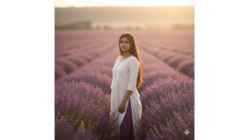 लड़कियों के लिए ट्रेंड कर रहे Google Gemini AI Lavender Field Photo Editing Prompts का फोकस एक क्लियर पोर्ट्रेट को स्वप्निल और सौम्य विज़ुअल में बदलना है।