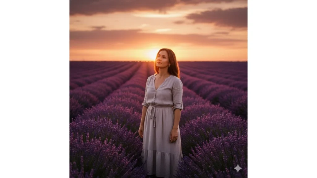 कल्पना कीजिए—बालों में हल्की हवा, सामने तक फैले बैंगनी लैवेंडर के खेत, और पीछे ऐसा सॉफ्ट सूर्यास्त जो किसी हाई-एंड परफ्यूम ऐड जैसा लगे। ये Gemini AI प्रॉम्प्ट्स उसी कल्पना को एक सामान्य सेल्फी से 8K सिनेमैटिक आर्टवर्क में बदलने के लिए बनाए गए हैं।
