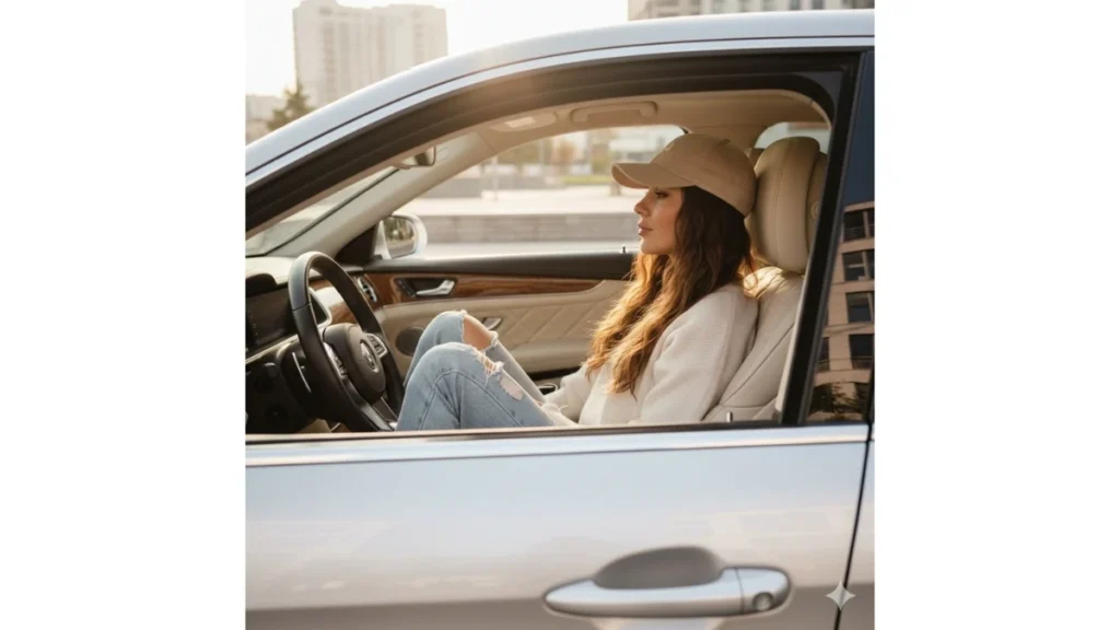 "Ultra-realistic cinematic portrait using the uploaded image with the same face preserved. Stylish woman sitting calmly in the driver’s seat of a luxury car, photographed from the side window. Wearing a casual outfit with a cap, hair open and natural, relaxed, confident pose. Cream-colored leather seats with soft daylight reflections on the glass. Clean, elegant lifestyle aesthetic with cinematic realism."