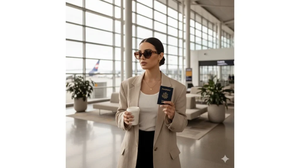 “Ultra-realistic lifestyle portrait using the uploaded image with the same face preserved. A young woman standing inside a modern airport terminal, holding a coffee and a passport. Wearing an oversized blazer, sunglasses, sleek bun. Bright natural lighting, travel-core aesthetic.”
