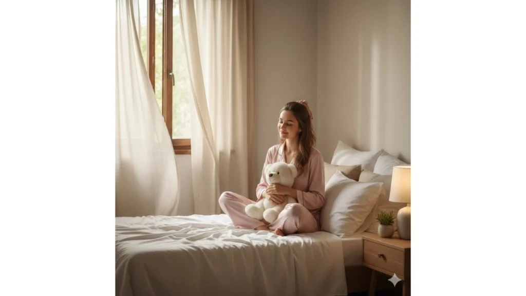 "Ultra-realistic portrait using the uploaded image with the same face preserved. A woman sitting comfortably on a neatly made bed with light, silky sheets. Wearing a light pink pajama set, relaxed posture, gentle smile. Holding a white teddy bear, hair down or casually tied. Warm, serene room with soft lighting, flowing curtains, and a calm evening vibe."