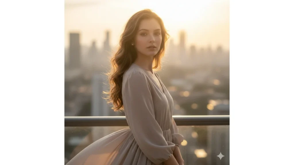 “Ultra-realistic cinematic portrait using the uploaded image with the same face preserved. A young woman standing on a high-rise balcony during golden hour, warm sunlight softly illuminating her face. Wearing a neutral-toned flowy dress, minimal makeup, loose hair moving gently in the breeze. Urban skyline blurred in the background, dreamy glow, luxury lifestyle aesthetic.”