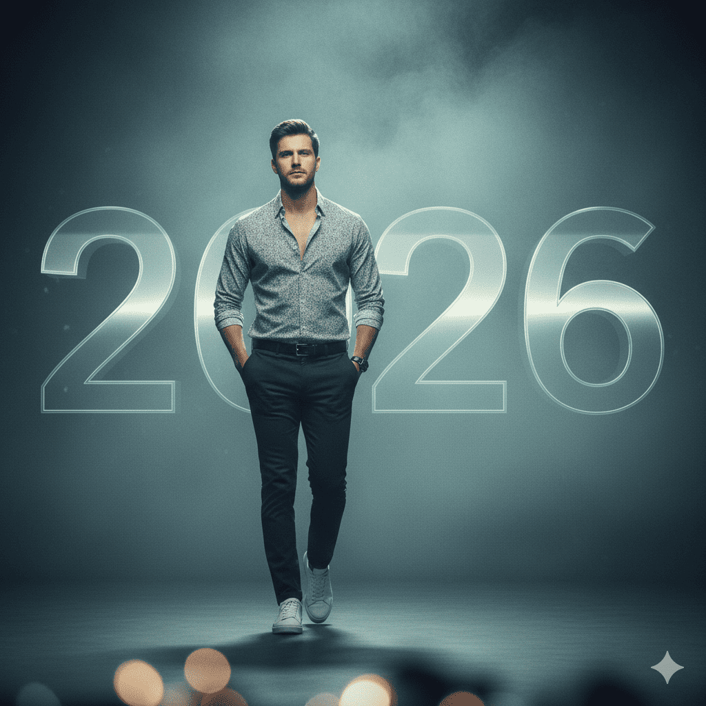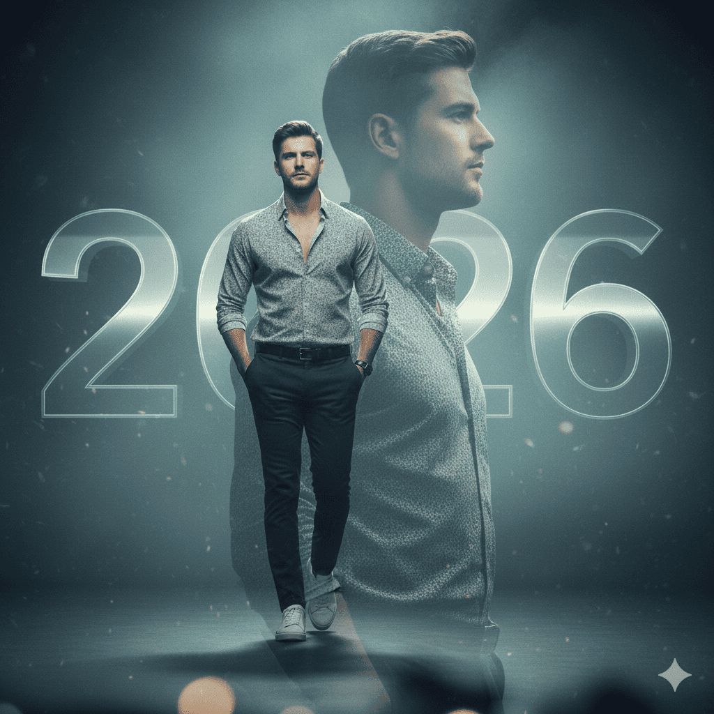 A photorealistic fashion magazine–style New Year poster. The young man poses confidently, wearing a stylish casual outfit. Clean background, editorial lighting, sharp focus. Bold “2026” typography integrated into the layout. Ultra-detailed, professional cover design. No face change.