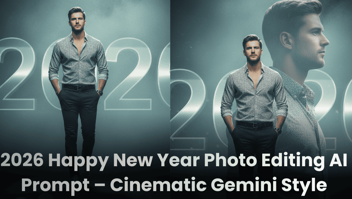 2026 Happy New Year Photo Editing AI Prompt:2026 Happy New Year सेलिब्रेशन के लिए cinematic photo editing इस समय सबसे ज़्यादा ट्रेंड में है। अब लोग साधारण फोटो एडिटिंग से आगे बढ़ चुके हैं और Gemini AI cinematic prompts की मदद से मूवी जैसी, प्रीमियम और बेहद रियलिस्टिक न्यू ईयर इमेज तैयार कर रहे हैं। यही वजह है कि सोशल मीडिया पर cinematic स्टाइल वाली तस्वीरें तेज़ी से वायरल हो रही हैं।