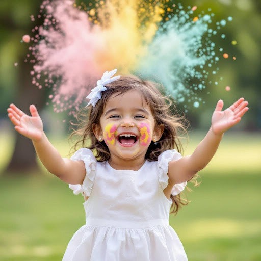 Prompt: Little girl in a white frock, cheeks covered with pink and yellow colors. Laughing with mouth open, both hands raised, throwing powder. Thick colorful burst above her head. Park’s background is softly blurred. Bright daylight, frozen motion, powder particles, detailed skin texture, realistic, joyful expression.