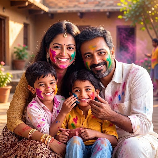 Prompt: Parents try to apply colors to children’s cheeks. Kids laughing. Soft color mist around the group. Rustic home courtyard background. Warm sunlight, natural shadows, ultra-detailed skin texture, authentic Holi stains on clothes, cinematic family photography.
