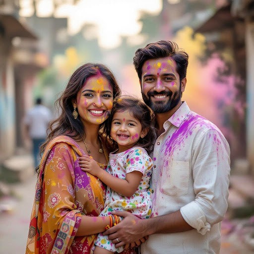 Prompt: Mother hugging daughter, father standing beside, smiling. All covered in Holi colors. A woman looking at the camera, a child laughing. Colorful burst behind them. Village street background blurred. Golden hour lighting, natural skin tones, realistic cloth texture.