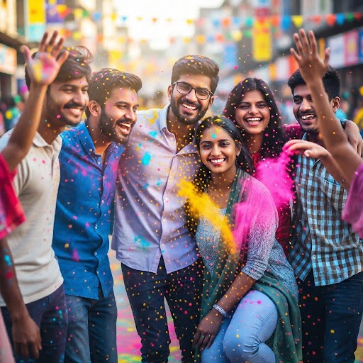 Prompt: A group of friends dancing with hands raised during the Holi festival, one person throwing colorful powder into the air. Street celebration setting with slightly blurred background and sharp focus on faces. Bright natural sunlight, high shutter speed, capturing realistic powder particles mid-air. Cinematic composition, shallow depth of field, natural skin tones, vibrant yet realistic colors, DSLR-style photography, energetic festive mood.