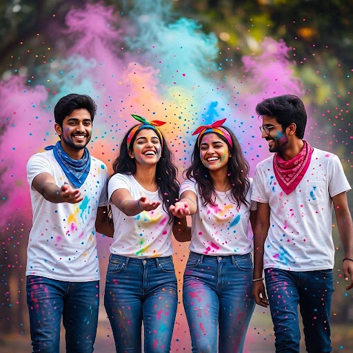 Prompt: Stylish group of friends wearing white T-shirts, jeans, and colorful bandanas, standing shoulder to shoulder with confident expressions, throwing multicolored Holi powder toward the camera. Studio setup with powder smoke background. Shot on an 85mm lens, f/2 aperture, controlled studio lighting, high shutter speed freeze effect, sharp skin texture, realistic fabric details, HDR color grading, shallow depth of field, DSLR-quality, photorealistic festival look.