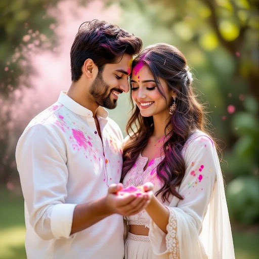 Prompt: A young couple in white outfits covered with soft Holi colors. Standing close, foreheads touching, eyes closed, smiling. A man holding pink powder, creating a burst effect. The outdoor garden background blurred. Warm daylight, detailed skin texture, realistic powder particles, shallow depth, natural romantic emotion.