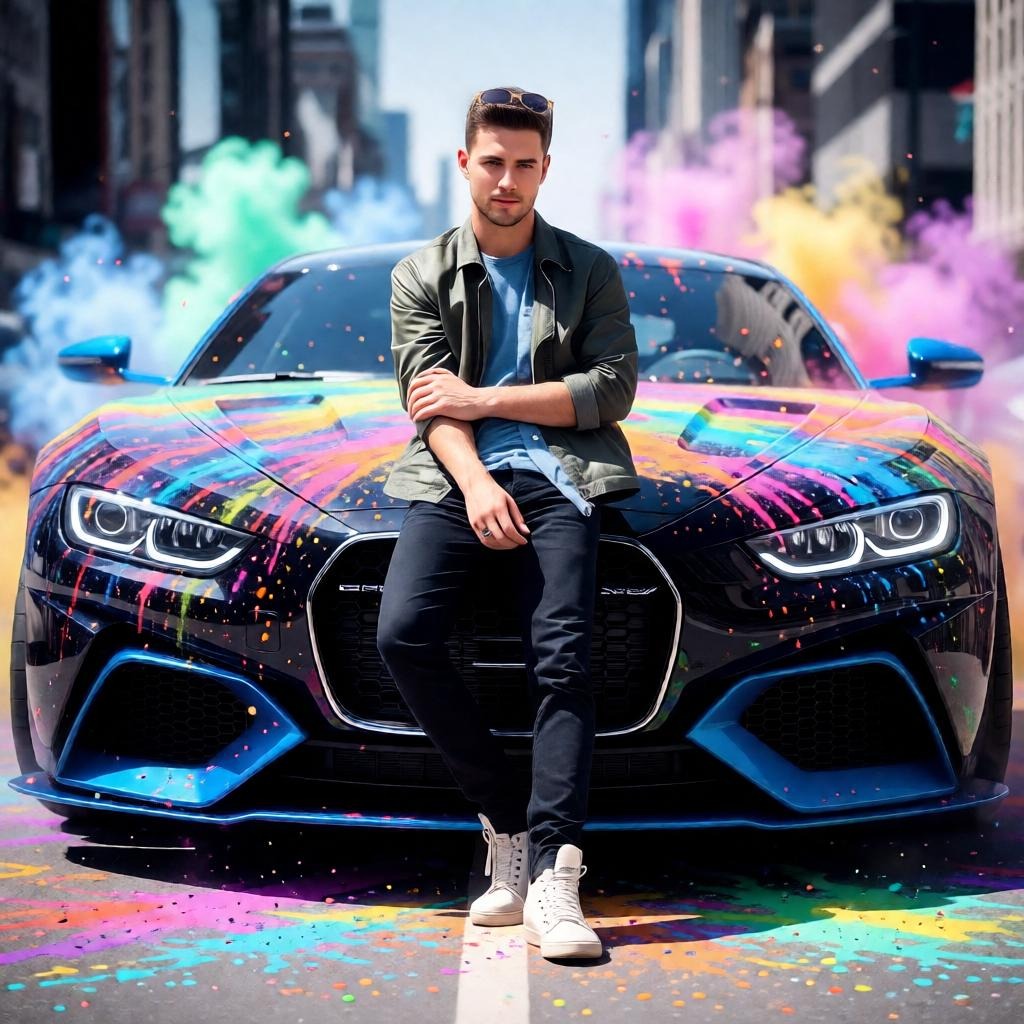 Prompt:Luxury car parked outdoors with soft Holi color powder spread across bonnet and sides, colorful smoke drifting around vehicle. Clean reflections on glossy paint surface, bright daylight environment, realistic color stains and powder particles, cinematic lighting, sharp focus, 50mm lens look, HDR color grading, ultra-realistic textures, professional automotive photography style.