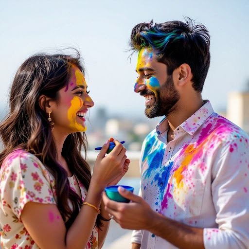 Prompt: A couple facing each other, laughing. A woman applying yellow color on man’s cheek, a man holding blue powder in his hand. Color cloud around waist level. Bright terrace background, clear sky. Natural lighting, realistic skin tones, visible powder grains, authentic Holi stains on clothes, and high-resolution DSLR style.