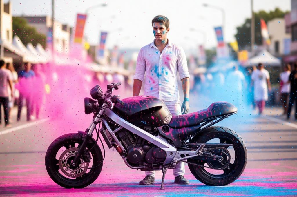 Prompt: Stylish sports bike parked on an open street during Holi festival, vibrant pink and blue powder exploding around the bike. The rider standing beside is wearing a white outfit with light-colored stains. Bright natural sunlight, realistic powder particles mid-air, reflections visible on bike body, cinematic composition, shallow depth of field, HDR lighting, ultra-detailed metal texture, DSLR-quality, photorealistic festival atmospher
