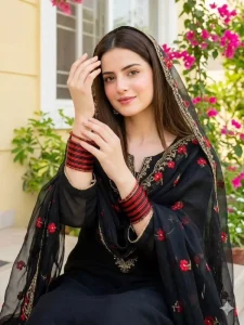 Convert the uploaded image into a young woman seating outdoors house ladders. She has soft fair skin, natural glowing makeup with light pink blush, subtle eyeliner, defined brows, and soft pink lipstick. Her long straight black to brown hair and partially covered with a Black embroidered chiffon dupatta.She is wearing an elegant Black traditional salwar kameez with delicate gold embroidery on the neckline and a sheer Black dupatta decorated with red floral embroidery. The dupatta is draped over her head and shoulders.She is also wearing red & Black bangles and a matching bracelet.Pose: She is gently showing her bangles in front of her face. looking at front with soft smile. Background: A soft pastel yellow building wall with a window, surrounded by lush green plants and bright pink bougainvillea flowers behind her.Lighting: Bright daylight, Bright Day sunlight, warm tones, smooth skin texture. Face features remain the same.