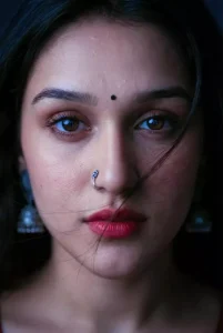 Hyper realistic cinematic portrait of the same young Indian woman (use reference face), intense eye contact with camera, deep brown glossy eyes with tiny human silhouette reflection inside the pupil, natural skin pores, soft makeup, bold red lips, elegant nose pin and forehead piercing.Loose wind-blown hair crossing part of her face. Expression confident and mysterious. Traditional silver jhumka earrings slightly visible. Lighting: dramatic moody studio lighting with one side illuminated and the other fading into shadow, dark blurred background. Shot using Sony Alpha A7R II, 85mm lens, f/1.8, shallow depth of field, ultra detailed, high dynamic range, professional photography, no cartoon, no logo.