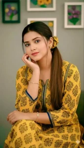 Ultra-realistic, 64k portrait of the same girl, face/body/outfit unchanged. She wears the same yellow printed kurti with navy-blue borders, seated with one hand touching her face. Long straight hair in a half-pony with the same printed scrunchie, soft expression, minimal makeup, same gold earrings, gold bangles, bracelet. Indoor warm lighting and gery wall background flower preserved. Enhance clarity, texture, fabric details, and color depth without altering her look or pose.