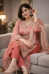 Using uploaded image face and body Ultra realistic, 32k, a 25 year old South Asian women sitting on a modern sofa indoors. Dark wearing a pastel red embroidered kurti with delicate silver threadwork, red pastel trousers, a sheer dupatta draped elegantly over her shoulders. She has long dark hair styled in. smiling gently, eyes-camera, adjusting a large traditional silver jhumka earring. Skin tone, Natural makeup with rosy tones. Her feet are visible wearing Metro Women's Sandal Heels.
