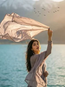Use the attached image/s of the model as facial reference and physical features, keeping her real face. A strong gust of wind lifts the entire dupatta upward, sending the translucent fabric flying above her like a banner. She instinctively raises one hand to hold it as the other side streams dramatically into the air. The sunlight shines directly through the fabric, turning it into glowing lavender light suspended above the lake. The camera freezes the moment mid-motion using a fast shutter speed, capturing every fold and ripple of the cloth. Her hair lifts slightly in the wind while the mountains remain calm and silent in the background. The turquoise water contrasts with the warm golden sky, creating a cinematic color palette that feels vibrant yet natural. A flock of birds appears in the distance, moving across the frame in a gentle arc. The shot feels alive with energy, like a sweeping moment in a Bollywood song where the wind becomes part of the choreography.Vertical 9:16 aspect ratio.