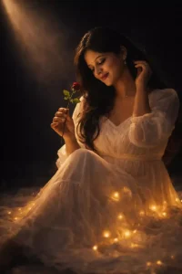A dreamy cinematic portrait of a young woman sitting gracefully on the floor in a dark studio, wearing a flowing soft white vintage dress with delicate sheer sleeves. She gently holds a small red rose in her hand and looks down at it with a peaceful, emotional expression. Warm golden spotlight beam shining diagonally from above, creating dramatic chiaroscuro lighting. Soft fairy lights glowing under the translucent fabric of her dress, illuminating it with warm magical light. Romantic, poetic atmosphere, soft shadows, glowing skin tones, elegant posture, dark background fading into black. Fine art photography style, ultra-realistic, cinematic lighting, shallow depth of field, volumetric light rays, 85mm lens, f1.4, ultra detailed, 8k resolution.”