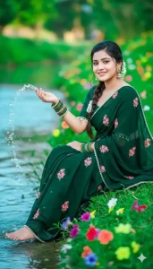 "A 64K DSLR ultra-realistic portrait of a young woman sitting by a riverbank green in a dark green chiffon saree with pearl border in embroidered flowers pink, matching blouse with pearl latkans. Braided hair with pearl gajra, jhumkas and bangles, bare feet at the river. Glowing smiling face, soft makeup, skin tone, one hand on lap and the other splashing blue water with frozen droplets. Flowers around, shallow depth of field, sharp eye face focus, natural light, cinematic color grading.
