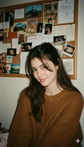 A young woman with her original face untouched, warm ivory skin, photographed with a point-and-shoot film camera. Her hair is clipped back loosely with a few strands falling across her forehead. She’s giving a soft grin, half playful, half shy. She wears a warm brown knit cardigan. Behind her: a messy bulletin board packed with postcards, sketches, and notes. The direct flash gives a gritty, vintage 90s bedroom mood.
