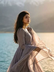Use the attached image/s of the model as facial reference and physical features, keeping her real face. A "poetic still from a quiet Bollywood romance," an ultra-dreamy, cinematic, and emotionally immersive aesthetic. The focus is on rare color harmony, atmospheric light, and fluid textile movement, creating a luxurious yet effortless elegance. She is immersed in the serenity of Pangong Lake, with its surreal turquoise water stretching beneath vast Himalayan skies and snow-soft mountains in the distance. Her expression carries a soft cinematic melancholy, her eyes gently focused toward the horizon as if lost in thought. She wears a luxurious flowing Anarkali silhouette crafted from ultra-light georgette layered over silk in a deep smoky lavender with muted silver undertones, designed to move dramatically with the mountain wind. The dress features delicate tonal threadwork and subtle mirror embroidery near the neckline, with a sheer dupatta drifting behind her like mist. The mountain wind lifts the dupatta and outer georgette layers, causing them to ripple softly and glow faintly where sunlight passes through. Stray threads of hair move across the frame, illuminated by the golden-hour backlight, adding realism. Her pose is graceful, standing among soft wild grasses near the lake's edge, one hand gathering a portion of the dupatta as the wind lifts it. The lake surface becomes a glowing mirror of amber sunlight, while the mountains dissolve into atmospheric haze. Captured with a 135mm cinematic telephoto lens at f/2.8 for strong subject isolation, the image features natural golden-hour backlighting, slight film grain, subtle highlight bloom, and faint chromatic aberration, giving it the tactile realism of a movie frame.