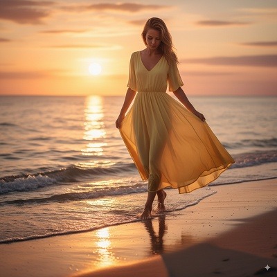 "Edit the photo to show the girl in a flowing summer dress, walking barefoot on a beach during sunset, cinematic golden glow."