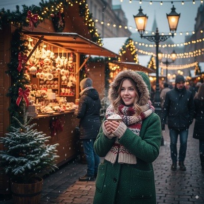"Transform the photo into a scene at a Christmas market, the girl in a wool coat holding hot chocolate, fairy lights in the background."