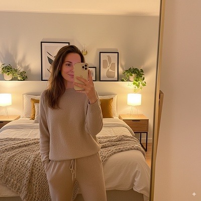 "Transform the selfie into a cozy mirror photo in a modern bedroom, warm yellow lighting, lifestyle photography style."