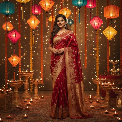 "Enhance this image to show the girl in a Banarasi saree with gold embroidery, celebrating Diwali with diyas and lanterns, colorful festive background."