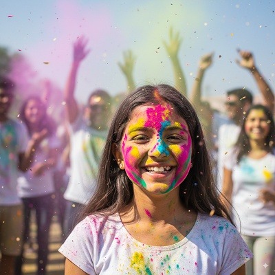 "Edit this photo to show the girl celebrating Holi, with colorful powders on her face, cheerful expression, festive crowd behind her."