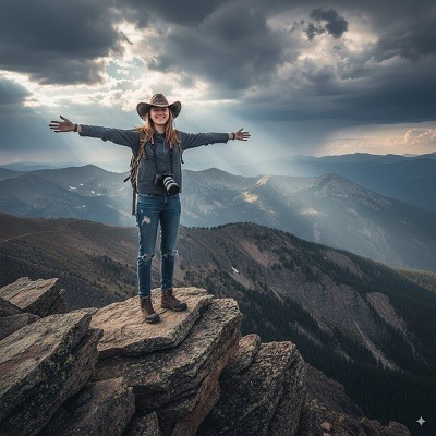 "Transform the photo into a traveler girl wearing jeans and hat, standing on a mountain cliff, dramatic cloudy sky, adventure photography style."