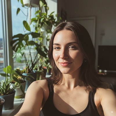 "Make this selfie look like it was taken in natural daylight, minimal makeup, near a window with plants, realistic skin texture, Instagram aesthetic."