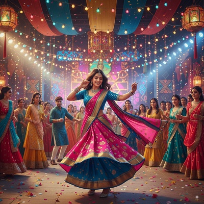 "Enhance the photo to show the girl dancing in a modern saree during Navratri Garba night, vibrant crowd, colorful festive lighting."