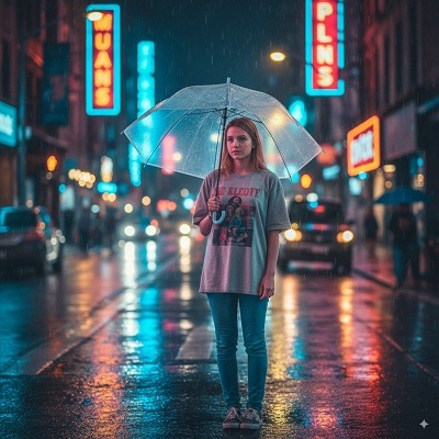 "Edit the photo to place the girl in a neon-lit street at night, casual t-shirt, cinematic bokeh effect in the background."