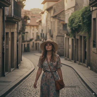 "Make this picture look like the girl is exploring a European old town street, cobblestone path, retro vintage film look."