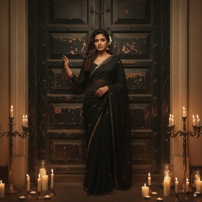 "Transform the uploaded photo into a young woman in a black chiffon saree, posing near a vintage wooden door, soft candlelight, elegant retro look."