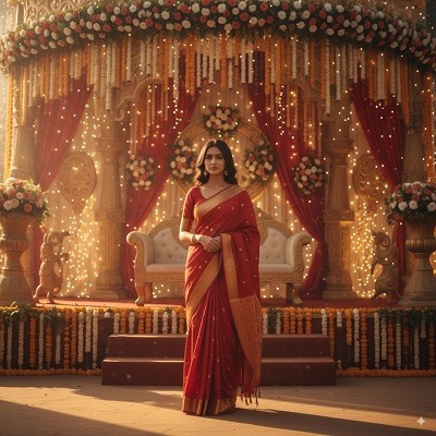 "Edit this photo into an Indian girl wearing a red silk saree, standing in front of a decorated wedding stage, golden hour lighting, cinematic photography style."