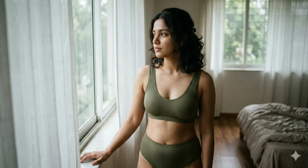 सुबह की हल्की धूप में 20 साल की खूबसूरत भारतीय लड़की, wearing soft pastel lingerie, window light, calm mood, natural pose, ultra realistic, cozy aesthetic reel vibe