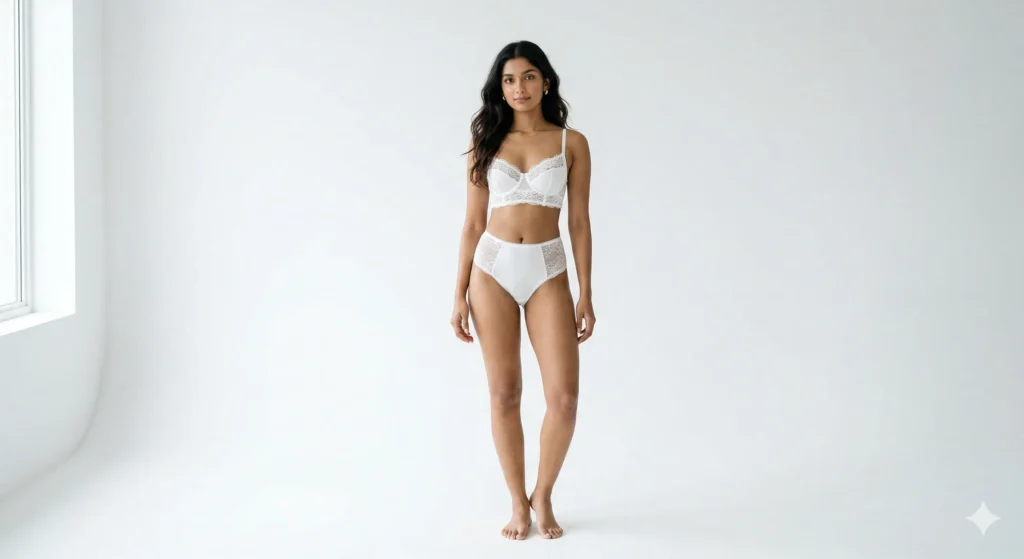 20-year-old Indian female model in white lingerie, clean white background, soft shadows, minimalist aesthetic, ultra realistic photography