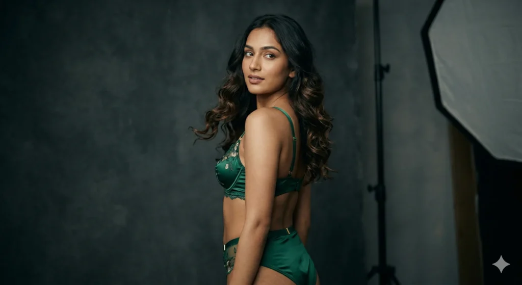 A stunning 20-year-old Indian girl in stylish lingerie, soft natural lighting, realistic skin texture, slow motion hair movement, cinematic vibe, ultra HD, DSLR quality -- trending Instagram reel style