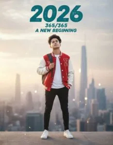 A cinematic portrait of a stylish man, standing one hand in his pocket and the other holding the strap of his backpack, looking slightly upward as if embracing new possibilities. He wears a varsity jacket, a white tee, tapered black joggers, and clean white sneakers. Above him, large stylized text reads “2026” in a bold, slightly distressed teal font. Meanwhile, smaller text below displays “365/365” and “A NEW BEGINNING”. Additionally, the scene uses a cinematic photography style with highly detailed visuals, soft lighting, and a dreamy atmosphere to emphasize the New Year theme.