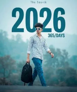A photorealistic cinematic shot of a young Indian man walking confidently from left to right across a soft blurred foreground, button-down shirt, blue cargo pants, holding a black backpack in her left hand, background is a misty ethereal landscape dominated by muted teal blue and light gray tones, cinematic lighting, highly detailed, 8k, new year theme, Overlay text design: large bold slightly distressed teal font reading “2026”, smaller text below reads “365/DAYS”, small text at very top reads “The Souvik” –ar 4:5 –v 6.0 –style raw. No face chenge