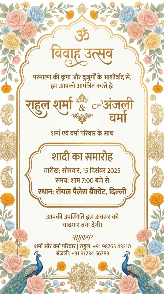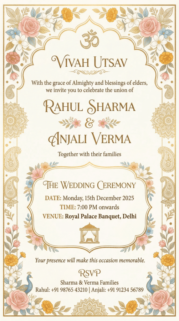 इसमें दूल्हे का नाम राहुल शर्मा और दुल्हन का नाम अंजली वर्मा शामिल करें।