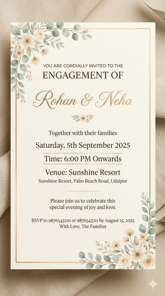 कार्ड का लुक कैसा होना चाहिए, यह बताएं। जैसे पारंपरिक, मॉडर्न, फ्लोरल, रॉयल या मिनिमल थीम—इससे डिजाइन का पूरा फील तय होता है। - नाम और कार्यक्रम का विवरण