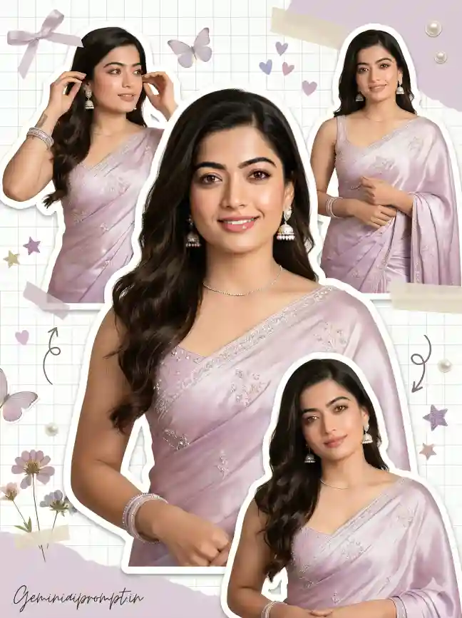 (Use uploaded reference face exactly, zero modification) FACE LOCK — ZERO MODIFICATION POLICY Face must remain 100% identical to the uploaded reference image. No reshaping of eyes, nose, lips, jawline or hairstyle. No beautification filters or smoothing effects allowed. Preserve natural skin texture, pores and facial proportions so the identity remains perfectly recognizable in ultra-HD clarity. ASPECT RATIO • 3:4 vertical STYLE Ultra-realistic Pinterest scrapbook collage portrait with dreamy feminine moodboard aesthetic. Professional DSLR portrait photography mixed with scrapbook design elements. 8K ultra-high resolution. SCENE DESCRIPTION Create a dreamy scrapbook collage featuring multiple cut-out portraits of the same girl wearing a shimmering pastel lilac satin saree, arranged like a cute Pinterest moodboard page. OUTFIT DETAILS A pastel lilac satin saree with delicate silver floral embroidery and soft shimmering borders, paired with a minimal sleeveless blouse with subtle bead embroidery. ACCESSORIES Elegant pearl jhumka earrings, a delicate silver chain necklace, and glass bangles. HAIRSTYLE Long dark hair styled in soft flowing waves with natural volume. MAKEUP Natural glowing makeup with soft blush, winged eyeliner and glossy pink lips. COLLAGE COMPOSITION • Main center portrait: gentle smile looking directly at camera • Top left: playful pose adjusting hair near ear • Top right: holding the saree pallu with a soft smile • Bottom portrait: relaxed pose looking slightly downward Each portrait appears like paper cut-out stickers with white borders placed on scrapbook paper. SCRAPBOOK DECOR ELEMENTS Add decorative elements such as: • ribbon bows • pastel butterflies • tiny hearts • pressed flowers • glitter stars • cute doodle arrows • small pearl stickers BACKGROUND White grid scrapbook background with soft pastel lilac accents and paper tape textures. LIGHTING Soft indoor sunlight creating warm dreamy glow and smooth skin tones. CAMERA & STYLE Captured using professional DSLR camera with 85mm portrait lens, extremely sharp facial focus with soft Pinterest-style color grading. IMAGE QUALITY Ultra-detailed skin texture, crisp saree fabric detail, dreamy aesthetic collage composition. NEGATIVE PROMPT blur, distorted anatomy, cartoon style, CGI characters, extra limbs, watermark artifacts. TEXT / SIGNATURE Add “Geminiaiprompt.in” at the bottom-left corner, HANDWRITTEN SIGNATURE-STYLE typography, thin cursive strokes, small size, subtle premium elegance, white or soft off-white color.