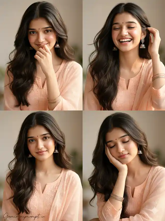 (Use uploaded reference face exactly, zero modification) FACE LOCK — ZERO MODIFICATION POLICY Face must remain 100% identical to the uploaded reference image. Do not reshape the jawline, eyes, nose, lips or hairstyle. No beautification filters, no smoothing effects, no identity changes. Preserve natural skin tone, pores and facial proportions so the identity remains perfectly recognizable in ultra-HD clarity. ASPECT RATIO • 3:4 vertical STYLE Ultra-realistic four-panel aesthetic portrait collage with soft feminine vibe. Professional DSLR portrait photography combined with dreamy editorial composition. 8K ultra-high resolution. SCENE DESCRIPTION Create a four-panel collage portrait of a beautiful young Indian girl with long flowing dark hair and a small red bindi, captured in warm natural sunlight. OUTFIT DETAILS She is wearing a soft pastel peach kurti with delicate embroidery and a light chiffon dupatta, creating a gentle ethnic aesthetic. ACCESSORIES Minimal jewelry including small silver jhumka earrings and thin bangles. HAIRSTYLE Long dark hair styled in soft loose waves falling naturally over the shoulders. MAKEUP Natural glowing makeup with light blush, subtle eyeliner and soft pink lips. FOUR-PANEL COMPOSITION Top Left Panel She smiles softly while looking slightly downward, hand gently touching her lips with a shy expression. Top Right Panel Bright joyful laughter with eyes closed, hair slightly moving as she brushes a strand behind her ear. Bottom Left Panel Gentle eye contact with the camera, soft confident smile and relaxed posture. Bottom Right Panel Serene peaceful expression with eyes closed, cheek resting softly on her hand. BACKGROUND Minimal soft background with warm sunlight glow and subtle neutral tones. LIGHTING Warm natural light creating soft highlights and dreamy shadows. CAMERA & STYLE Captured with professional DSLR camera using 85mm portrait lens, extremely sharp facial focus with soft cinematic depth of field. IMAGE QUALITY Ultra-detailed skin texture, realistic hair strands and natural color grading. NEGATIVE PROMPT blur, distorted face, cartoon style, CGI characters, extra limbs, watermark artifacts. TEXT / SIGNATURE Add “Geminiaiprompt.in” at the bottom-left corner, HANDWRITTEN SIGNATURE-STYLE typography, thin cursive strokes, small size, subtle premium elegance, white or soft off-white color.