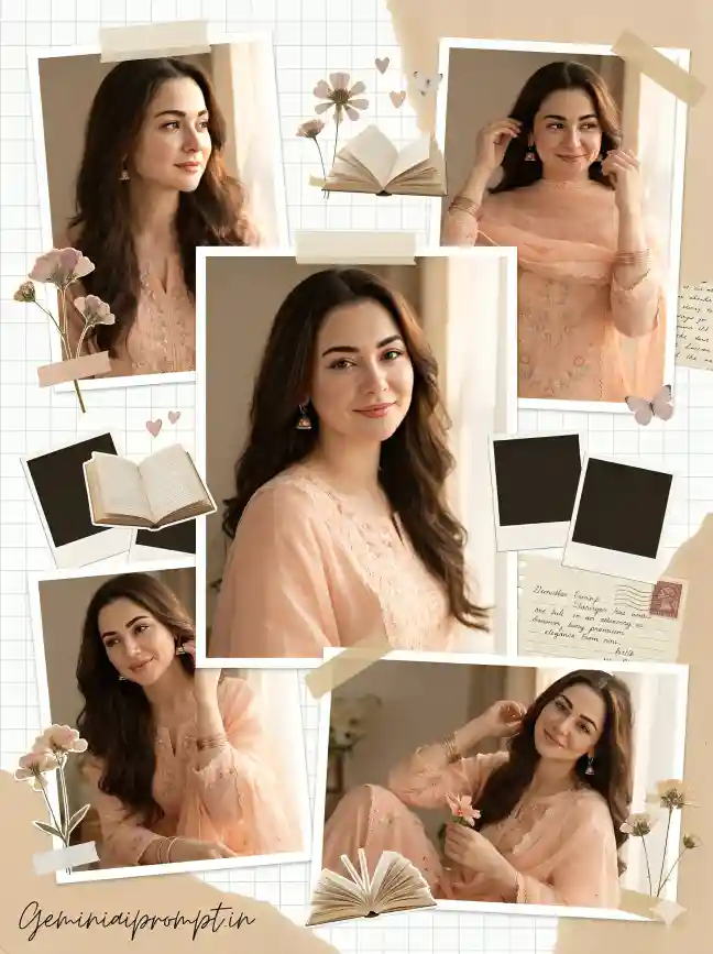 (Use uploaded reference face exactly, zero modification) FACE LOCK — ZERO MODIFICATION POLICY Face must remain 100% identical to the uploaded reference image. No reshaping of jawline, eyes, nose, lips or hairstyle. No beautification filters, smoothing, or artificial skin changes allowed. Preserve natural skin tone, pores, and facial proportions so the identity remains perfectly recognizable in ultra-HD clarity. ASPECT RATIO • 3:4 vertical STYLE Ultra-realistic Pinterest scrapbook collage portrait with dreamy feminine aesthetic. Professional DSLR portrait photography mixed with scrapbook moodboard design. 8K ultra-high resolution. SCENE DESCRIPTION Create a dreamy scrapbook collage featuring multiple portraits of the same girl wearing a soft pastel peach embroidered salwar suit, arranged like a stylish Pinterest moodboard page. OUTFIT DETAILS A pastel peach traditional embroidered suit with delicate floral threadwork and a light chiffon dupatta with lace trim. ACCESSORIES Minimal elegant jewelry including small pearl jhumka earrings and thin rose-gold bangles. HAIRSTYLE Long dark hair styled in soft loose waves flowing naturally over the shoulders. MAKEUP Natural glowing makeup with soft blush, subtle eyeliner and glossy peach lips. COLLAGE COMPOSITION • Main center portrait: smiling gently toward the camera • Top left portrait: looking sideways with soft expression • Top right portrait: adjusting dupatta with playful smile • Bottom portrait: relaxed pose holding a flower Each portrait appears as cut-out photo stickers layered on scrapbook paper. SCRAPBOOK DECOR ELEMENTS Include decorative elements such as: • pressed flowers • open books • Polaroid photo frames • handwritten notes • vintage stamps • paper tape strips • tiny hearts and butterflies BACKGROUND Soft white scrapbook grid background with warm beige paper textures and subtle pastel accents. LIGHTING Soft natural sunlight entering from a window creating warm dreamy highlights and cozy tones. CAMERA & STYLE Shot using professional DSLR camera with 85mm portrait lens, extremely sharp face focus with soft cinematic depth-of-field. IMAGE QUALITY Ultra-detailed skin texture, crisp embroidery detail, Pinterest aesthetic collage composition. NEGATIVE PROMPT blur, distorted anatomy, cartoon style, CGI characters, extra limbs, watermark artifacts. TEXT / SIGNATURE Add “Geminiaiprompt.in” at the bottom-left corner, HANDWRITTEN SIGNATURE-STYLE typography, thin cursive strokes, small size, subtle premium elegance, white or soft off-white color.