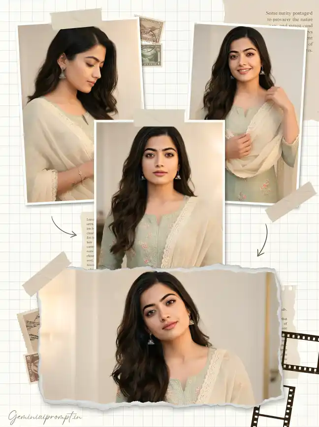 (Use uploaded reference face exactly, zero modification) FACE LOCK — ZERO MODIFICATION POLICY Face must remain 100% identical to the uploaded reference image. Do not reshape jawline, eyes, nose, lips or hairstyle. No beautification filters or smoothing effects allowed. Preserve natural skin texture, pores and facial proportions so the identity remains perfectly recognizable in ultra-HD clarity. ASPECT RATIO • 3:4 vertical STYLE Ultra-realistic Pinterest scrapbook collage portrait with cozy feminine aesthetic. Chest-level framing only (mid-torso to head). Professional DSLR portrait photography blended with scrapbook design elements. 8K ultra-high resolution. SCENE DESCRIPTION Create a dreamy scrapbook collage composition featuring a confident Indian woman wearing a soft pastel sage-green embroidered kurti with a delicate chiffon dupatta. Multiple chest-level portraits appear across the collage like layered paper cut-outs. OUTFIT DETAILS A sage-green embroidered kurti with subtle floral patterns and light threadwork, paired with a sheer cream dupatta with delicate lace border. ACCESSORIES Minimal jewelry including small silver jhumka earrings and a thin delicate bracelet. HAIRSTYLE Long natural dark hair styled in soft loose waves falling gently over the shoulders. COLLAGE COMPOSITION • Center portrait: confident expression looking directly at camera • Top left: soft side profile looking downward • Top right: slight smile while adjusting dupatta near shoulder • Bottom portrait: relaxed expression with chin slightly tilted Each portrait appears as torn paper cut-out frames with soft shadow depth. SCRAPBOOK DECOR ELEMENTS Add aesthetic scrapbook elements including: • torn paper textures • neutral beige tape strips • vintage postage stamps • subtle serif text notes • hand-drawn arrows • small film strip frames BACKGROUND Soft white grid scrapbook background with light beige paper textures. LIGHTING Indoor soft lighting with gentle warm highlights and slight mirror reflection glow. CAMERA & STYLE Captured using 85mm portrait lens, extremely sharp facial focus with soft dreamy color tones. IMAGE QUALITY Ultra-detailed skin texture, clean lighting, realistic fabric folds and cinematic collage layout. NEGATIVE PROMPT blur, distorted anatomy, cartoon style, CGI faces, extra limbs, watermark artifacts. TEXT / SIGNATURE Add “Geminiaiprompt.in” at the bottom-left corner, HANDWRITTEN SIGNATURE-STYLE typography, thin cursive strokes, small size, subtle premium elegance, white or soft off-white color.