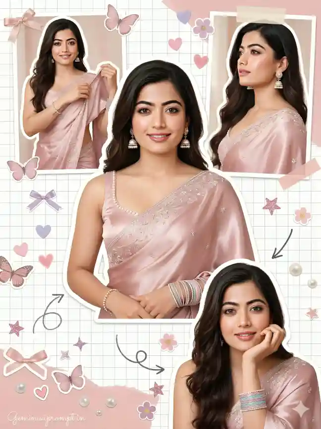 (Use uploaded reference face exactly, zero modification) FACE LOCK — ZERO MODIFICATION POLICY Face must remain 100% identical to the uploaded reference image. Do not reshape the jawline, eyes, nose, lips or hairstyle. No beautification filters, smoothing effects, or identity alterations allowed. Preserve natural skin texture, pores, and facial proportions so the identity remains perfectly recognizable in ultra-HD clarity. ASPECT RATIO • 3:4 vertical STYLE Ultra-realistic Pinterest scrapbook collage portrait with dreamy feminine aesthetic. Professional DSLR fashion portrait combined with scrapbook graphic design elements. 8K ultra-high resolution. SCENE DESCRIPTION Create a dreamy scrapbook collage featuring multiple cut-out portraits of the same girl wearing a shimmering pastel rose-pink satin saree, arranged like a Pinterest aesthetic moodboard page. OUTFIT DETAILS A rose-pink satin saree with delicate silver embroidery and subtle shimmer, paired with a minimal sleeveless blouse with pearl detailing. ACCESSORIES Elegant pearl jhumka earrings, a delicate bracelet, and pastel glass bangles. HAIRSTYLE Long dark hair styled in soft flowing waves with natural volume. MAKEUP Natural glowing makeup with light blush, winged eyeliner and glossy pink lips. COLLAGE COMPOSITION • Center portrait: gentle smile looking directly at camera • Top left: playful pose holding the edge of saree pallu • Top right: side profile portrait looking toward the distance • Bottom portrait: relaxed pose with chin resting lightly on hand Each portrait appears like paper cut-out stickers with white borders placed on scrapbook paper. SCRAPBOOK DECOR ELEMENTS Add decorative scrapbook items such as: • ribbon bows • butterflies • small pastel hearts • floral stickers • glitter stars • doodle arrows • pearl beads BACKGROUND White grid scrapbook background with pastel pink paper textures and tape elements. LIGHTING Soft indoor sunlight with warm dreamy glow and smooth skin highlights. CAMERA & STYLE Captured using professional DSLR camera with 85mm portrait lens, producing extremely sharp facial clarity with soft Pinterest-style color grading. IMAGE QUALITY Ultra-detailed skin texture, crisp saree fabric folds, dreamy aesthetic collage composition. NEGATIVE PROMPT blur, distorted anatomy, cartoon style, CGI characters, extra limbs, watermark artifacts. TEXT / SIGNATURE Add “Geminiaiprompt.in” at the bottom-left corner, HANDWRITTEN SIGNATURE-STYLE typography, thin cursive strokes, small size, subtle premium elegance, white or soft off-white color.